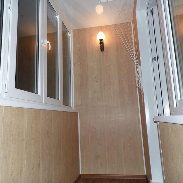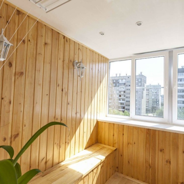 Для обшивки стен балкона деревянной вагонкой можно использовать любые породы дерева. Необходимо будет дополнительно её обработать специальными пропитками или покрасить, что бы продлить срок службы.